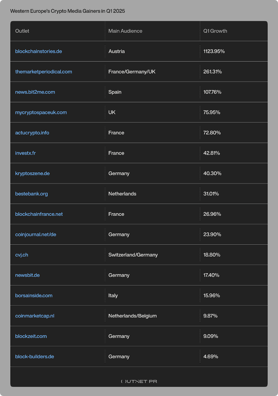 Western Europe’s crypto media gainers, tracked by Outset PR in Q1
