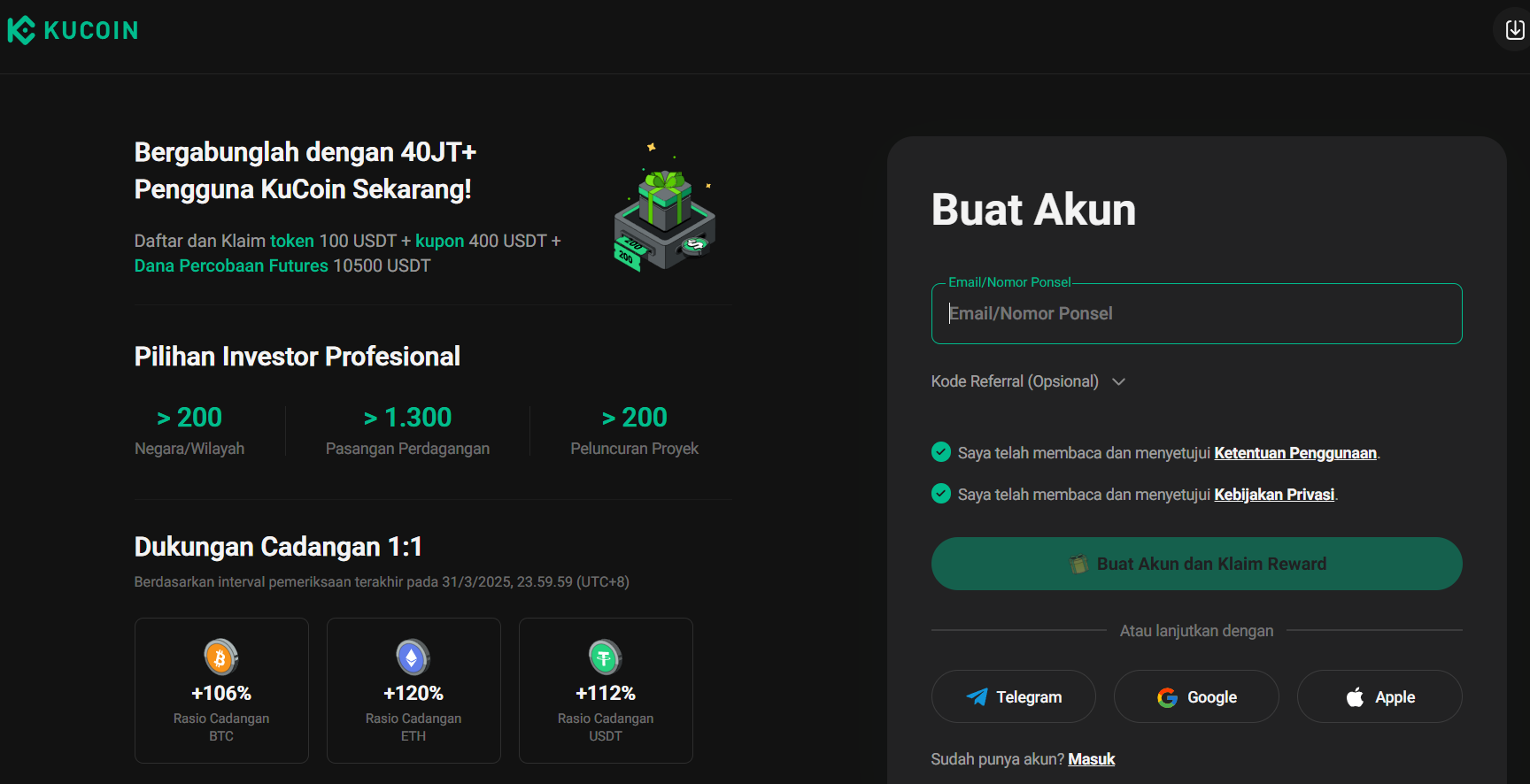 Setelah memilih KuCoin, buka akun dengan mendaftarkan email dan membuat password. Setelah akun aktif, kamu bisa menyetor dana ke akun KuCoin-mu. KuCoin menerima berbagai metode pembayaran seperti transfer bank atau kartu debit/kredit. Kalau kamu menggunakan DEX, kamu butuh wallet kripto sendiri dan harus mengisinya dengan aset kripto seperti USDT atau SOL.