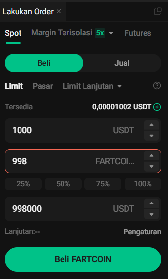 Setelah dana masuk, kamu bisa langsung membeli Fartcoin. Di KuCoin, cukup cari “FARTCOIN” di menu pencarian pasar, lalu pilih jenis order—market order (langsung beli sesuai harga pasar) atau limit order (tentukan sendiri harga beli). Prosesnya cepat, dan kamu akan langsung melihat Fartcoin muncul di portofoliomu setelah transaksi berhasil.