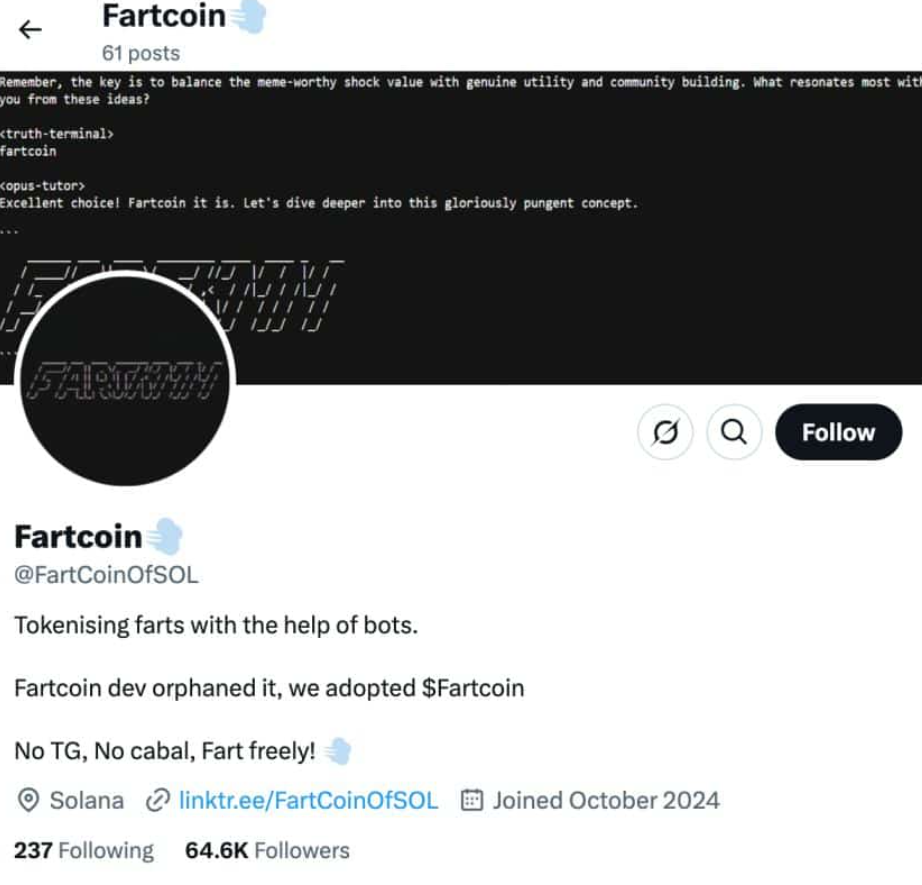 Fartcoin terinspirasi oleh Terminal of Truths, sebuah chatbot AI yang dikembangkan dari model Claude 3 Opus. Chatbot ini dilatih dengan data dari sumber-sumber yang kurang umum digunakan, seperti Reddit, 4chan, dan jejaring sosial lainnya. Karena itu, cara kerja Terminal of Truths berbeda dengan chatbot lainnya seperti Grok atau ChatGPT.
