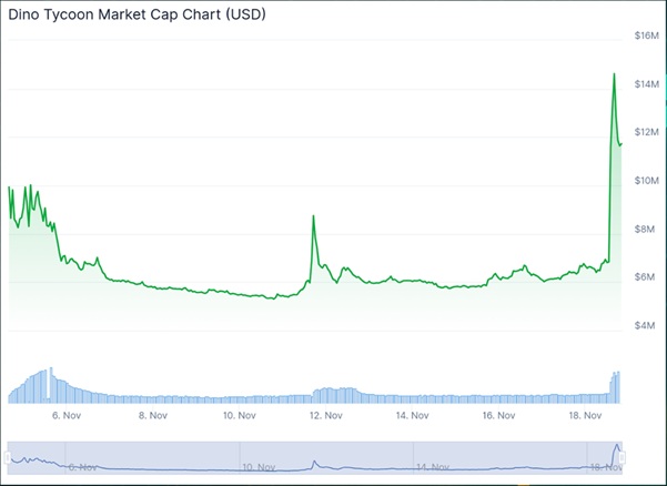 AI 驅動的模擬經營鏈遊 Dino Tycoon(TYCOON) 剛剛來了一波超猛拉盤,單夜暴漲 123%,在大盤走弱的情況下,直接領漲整個 Play-to-Earn(P2E)板塊。