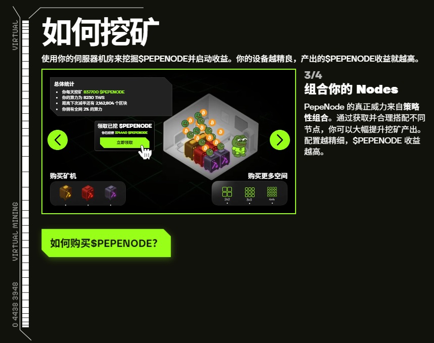 使用目前僅在預售階段開放的PEPENODE代幣,玩家可以通過購買節點開始搭建自己的挖礦礦機陣列。每一個節點都是獨一無二的,這為玩法引入了策略性和隨機性。如果能把合適的節點組合在一起,你就等於打造出一台源源不斷產出 Meme 代幣的“造幣機器”。