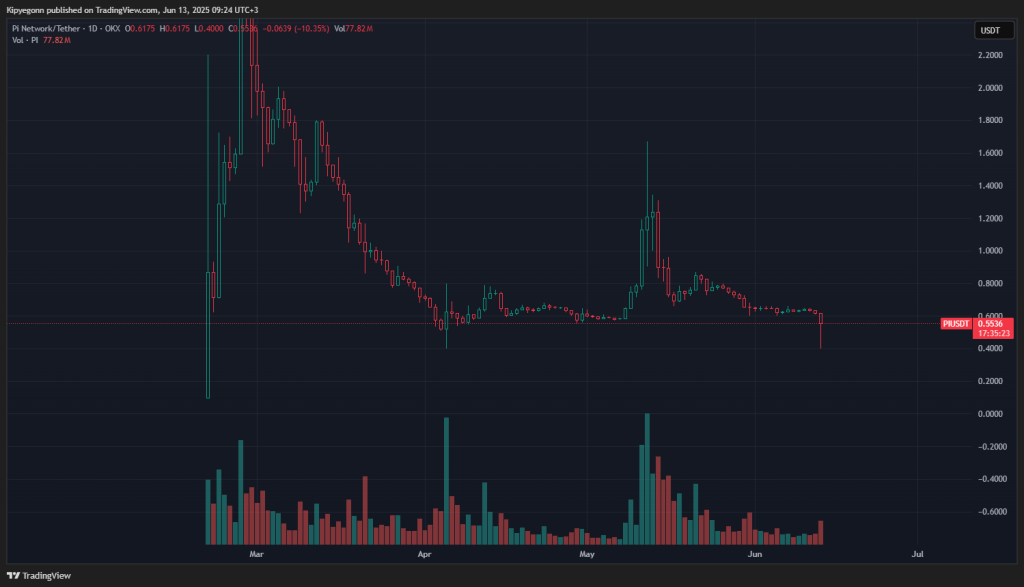 2025年6月13日時点のCoinGeckoによると、PIの取引価格は0.5596ドル(約88円)で、過去24時間で11%下落し、週間ベースでは10%近い損失を記録している。一時は0.40ドル(約63円)まで下落し、直近10日間のレンジを下方ブレイクした。