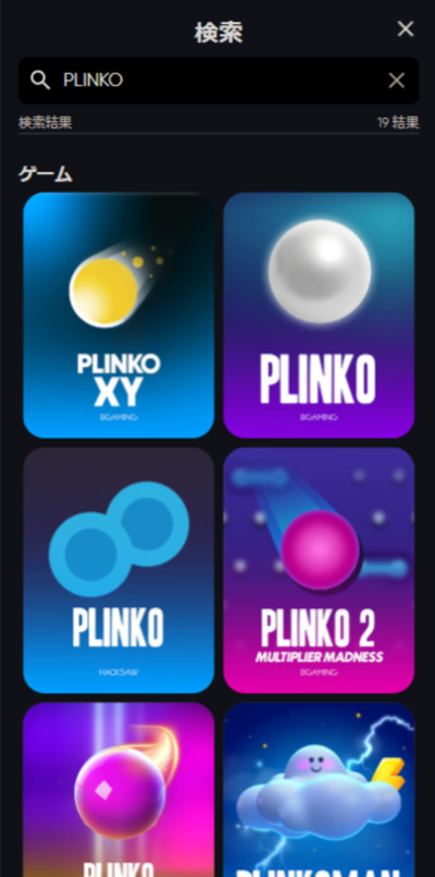 検索バーに「PLINKO」と英語で入力すると、関連するゲームの一覧が表示されます。