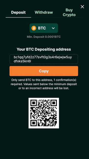 Nospiediet uz pogas “Deposit”, izvēlieties vienu no atbalstītajām bankas metodēm un pabeidziet darījumu, vai nu pārskaitot kriptovalūtu uz vietnes maku, vai turpinot maksājumu ar fiat valūtu.