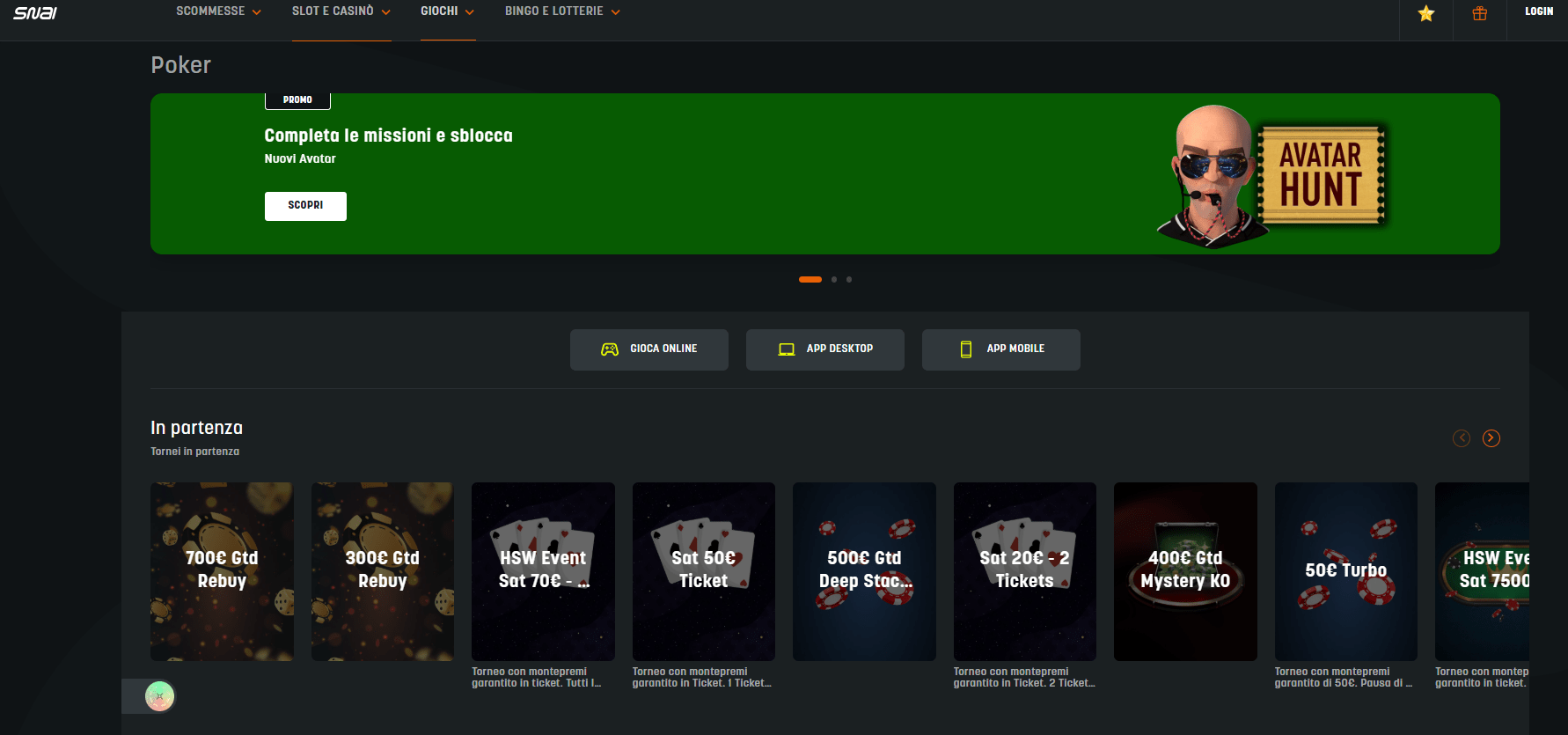 SNAI è uno dei brand più longevi e rispettati del panorama ADM. Offre una sezione Poker tra le più complete in Italia, con tornei giornalieri, freeroll, cash game e partite live. L’interfaccia è chiara e compatibile con Windows, macOS e dispositivi mobili. Ottima anche la gestione delle classifiche e dei bonus progressivi.
