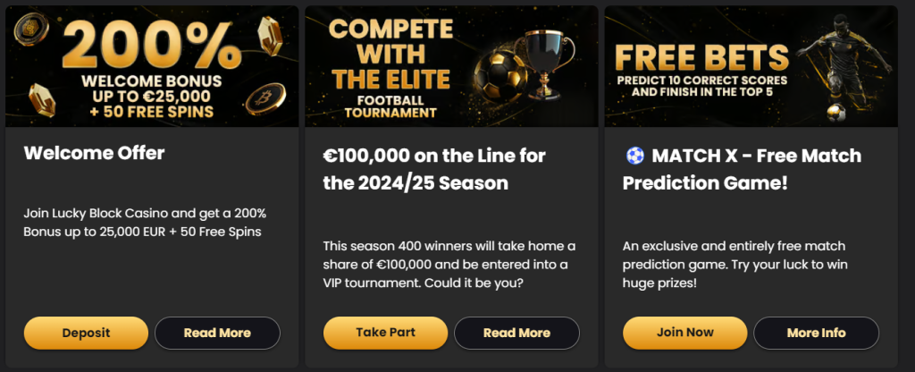 Pro nové hráče má Lucky Block připraven nepřekonatelný uvítací bonus 200 % na první vklad až do výše 25 000 €. K tomu navíc získáte 50 volných zatočení na populární automat Wanted Dead or a Wild. Pro získání bonusu je nutné vložit min 20 €, na splnění podmínek máte 14 dnů. Bonus je uvolňován postupně – 10 % bonusové částky se odemkne po vsazení šestinásobku vkladu.