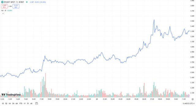 El éxito de IP se refleja en su precio. El token IP ha subido más de un 30% en las últimas 24 horas, cotizando actualmente en 3,34 dólares. La tendencia de su precio sigue al alza.