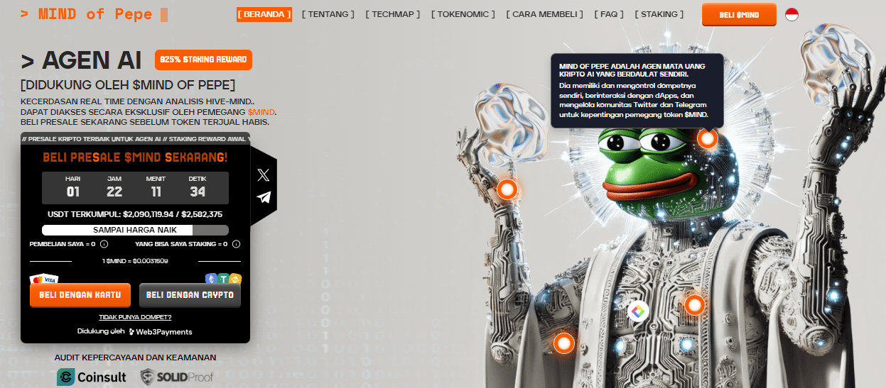 Saat ini, $MIND tersedia dengan harga lebih rendah dibandingkan tahap akhir presale, yaitu $0,0031509 per token. Presale ini telah berhasil mengumpulkan lebih dari $2 juta, menjadikannya salah satu yang paling menonjol tahun ini, terutama di tengah popularitas koin meme bertema Pepe.