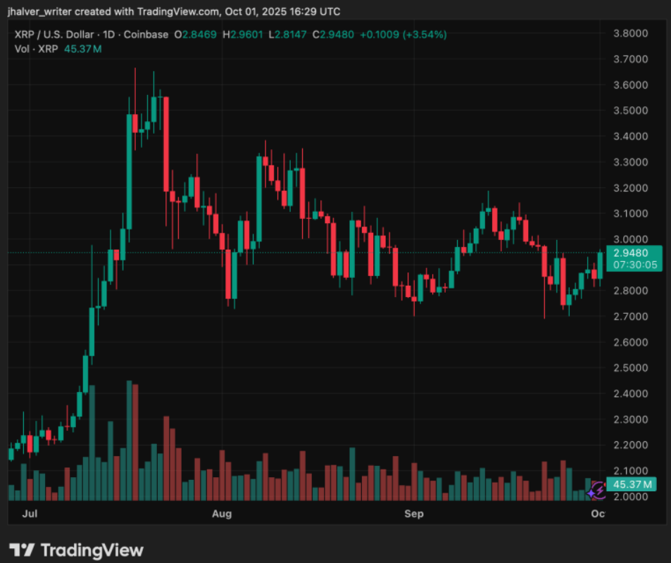 XRP ha chiuso il Q3 2025 con un rally del 31%, passando da 2,20 $ a luglio a 2,92 $ a fine settembre. È stato uno dei migliori trimestri degli ultimi anni, con la prima chiusura netta sopra una resistenza di lungo periodo dal 2017, riaccendendo l’ottimismo su un possibile replay dello storico breakout passato.