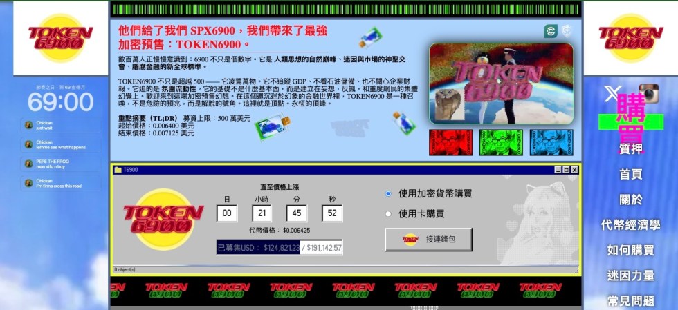 SPX6900的爆紅效應迅速在幣圈引發連鎖效應,不少項目企圖模仿其敘事邏輯與市場節奏,但最受關注的,莫過於自稱為其「接班者」的迷因幣TOKEN6900(T6900)。這並不是單純的複製品,而是一場自覺的諷刺續作。T6900將自己定位為「非腐敗代幣」(NCT,Non-Corrupt Token),用一種近乎哲學化的反建制精神,徹底嘲諷傳統金融與區塊鏈項目中對實用性與機構資本的盲目崇拜。