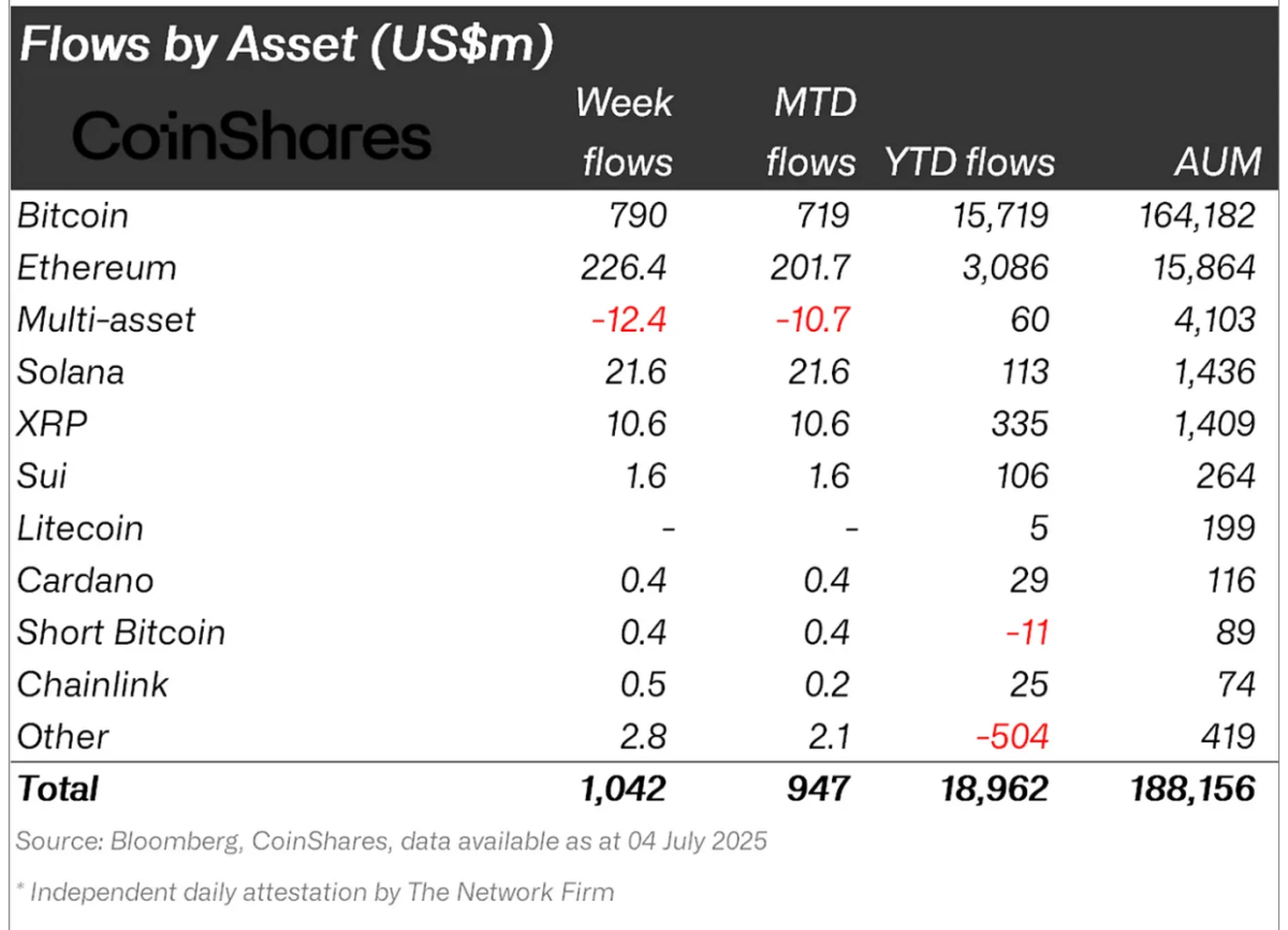 По данным CoinShares, инвестиционные продукты Bitcoin за последнюю неделю привлекли $790 млн. Хотя эта сумма по-прежнему является самой большой среди всех цифровых активов, она ознаменовала заметное снижение по сравнению со средним показателем в $1,5 млрд, наблюдавшимся в предыдущие три недели. Это замедление предполагает, что настроения инвесторов в отношении Bitcoin могут стабилизироваться или стать осторожными, поскольку актив приближается к своему историческому максимуму выше $111 000. Умеренность притока средств может отражать поведение, направленное на фиксацию прибыли, или нежелание увеличивать риски на повышенных уровнях цен.