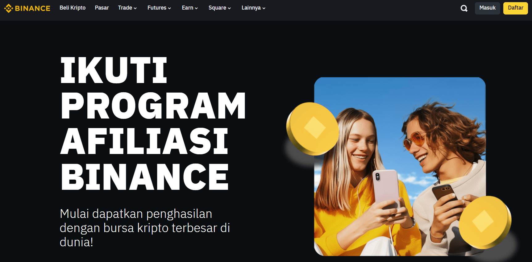 Sebagai bursa kripto terbesar di dunia, Binance menawarkan program affiliate marketing crypto dengan komisi hingga 50% dari biaya trading referral. Ini menjadikannya salah satu program akademi crypto affiliate dengan potensi pendapatan tertinggi di industri kripto.