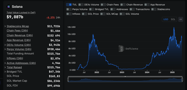 Ten szybki napływ kapitału wydarza się w momencie, gdy główny łańcuch Solany przewyższa rozwiązania warstwy 2 Ethereum – takie jak Base, Arbitrum i Optimism – przekraczając 9 miliardów dolarów całkowitej zablokowanej wartości na blockchain (TVL).