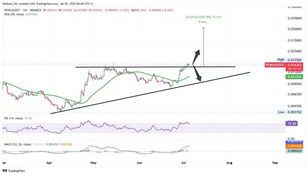 12時間足チャートでは、PENGUがレジスタンスを突破して上昇基調にあることが確認できる。直近では、0.01534ドル(約2.47円)付近の重要な抵抗帯を突破し、最新のローソク足は過去の高値0.0175ドル(約2.83円)に接近している。