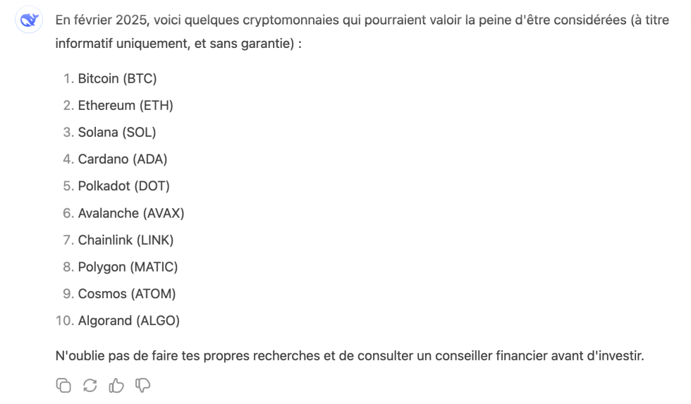 Lorsque l’on demande à DeepSeek de nous lister les meilleures cryptos à acheter pour février 2025, la réponse fuse et est composée uniquement de projets déjà bien établis avec Bitcoin, Solana, Ethereum, Cosmos ou encore Avalanche.