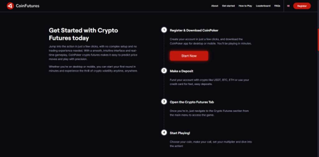 Accesează site-ul CoinFutures sau CoinPoker și apasă pe „Register”. Nu ai nevoie de KYC – doar o adresă de email, un nume de utilizator și o parolă. Anonimatul este garantat, ceea ce face platforma ideală de crypto futures trading pentru utilizatorii care pun preț pe confidențialitate sau locuiesc în țări unde accesul la platformele de crypto futures trading este restricționat.