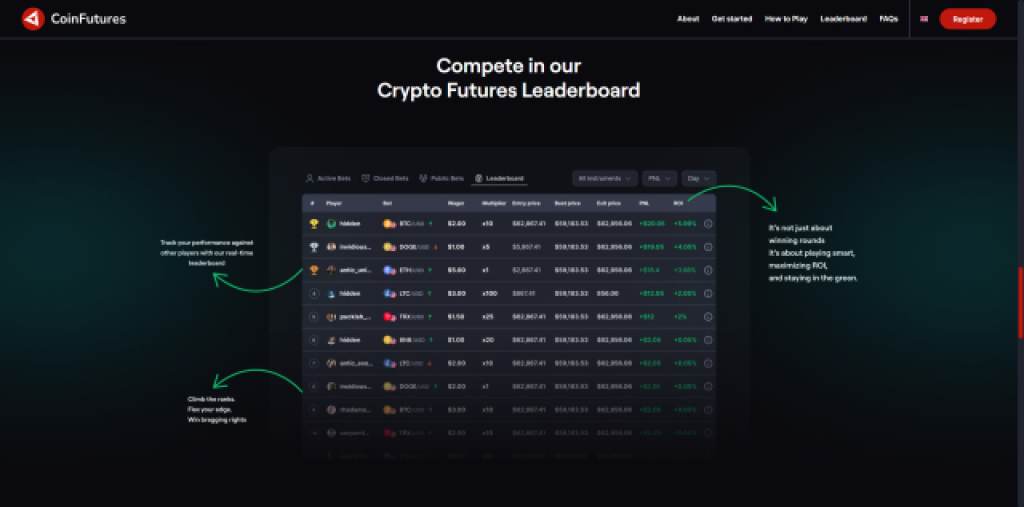 CoinFutures adaugă un element de „gamificare” printr-un clasament activ, care afișează cele mai profitabile pariuri din ultimele 24 de ore, 7 zile sau 30 de zile. Există topuri separate pentru fiecare criptomonedă, dar și un clasament general.