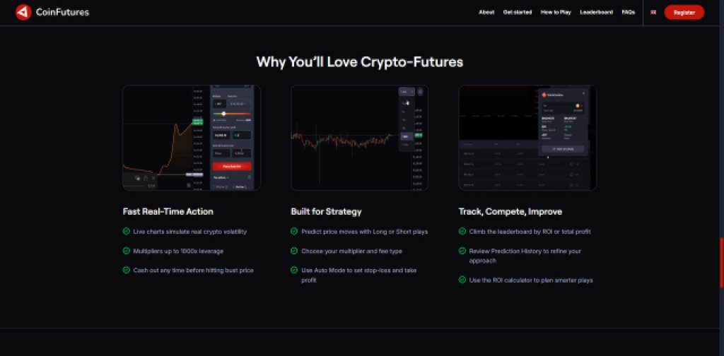 CoinFutures integrează grafice simulate cu date de piață în timp real (pentru direcție și dinamică), astfel încât utilizatorii pot urmări performanța pariurilor fără întârzieri. Aceste grafice oferă context, chiar dacă nu reflectă piețele reale.