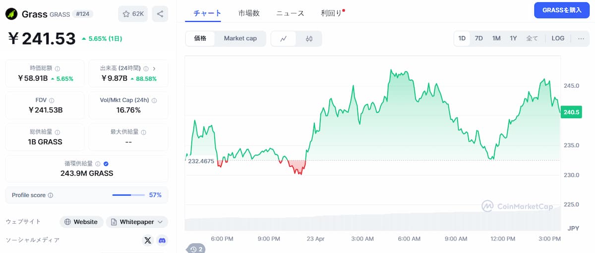 GRASSはユーザーが共有したインターネット帯域幅で報酬を得る分散型ネットワークです。時価総額は4億4,400万ドル(約665億円)で、完全希薄化後の評価額は16億ドル(約2,400億円)です。