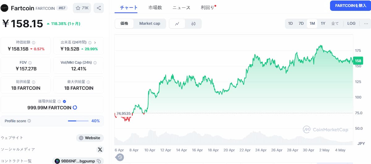 ファートコイン ($FARTCOIN) は、Truth Terminal AIチャットボットの提案で作成された仮想通貨です。ユニークで面白いコミュニティ主導の仮想通貨の一つです。