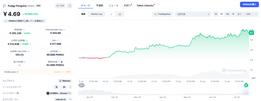 価格も今週だけで125%上昇しており、強気トレンドが継続中だ。現在、最も注目されているミームコインの一つが$PENGUであり、このような関心の高まりが価格上昇を後押ししている。