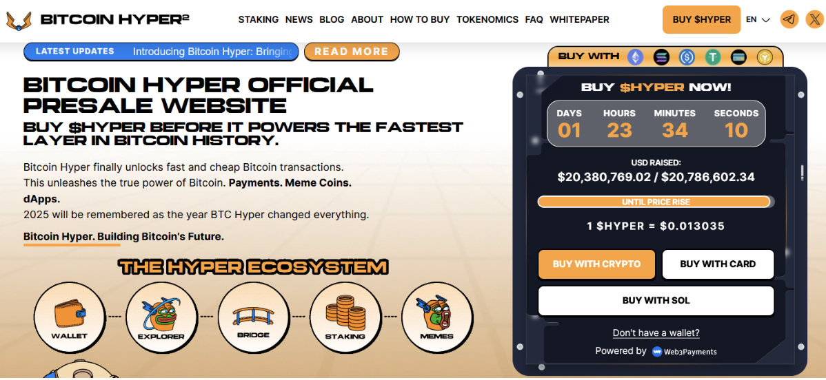 在比特幣價格屢創新高的背景下,一場新的資金浪潮正悄然湧向Layer 2賽道,Bitcoin Hyper(HYPER)作為構建在Solana虛擬機(SVM)上的比特幣擴容項目,已在短短數周內完成近2,300萬美元的融資,成為當前最受關注的預售項目之一。其背後的機構買盤與技術邏輯,正在重塑市場對於比特幣二層解決方案的想像。