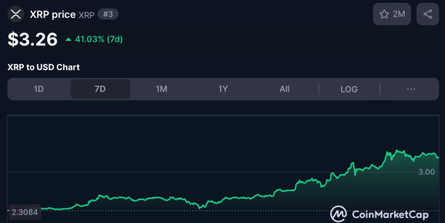 De Ripple koers is gestegen met 41,03% in de afgelopen week. Aan het begin van de maand stond de koers nog op $2,01, maar inmiddels heeft Ripple het hoogste punt in de afgelopen 7 jaar bereikt. De koers staat op dit moment op $3,26 en is nog maar 17 procent onder het all-time high van januari 2018.