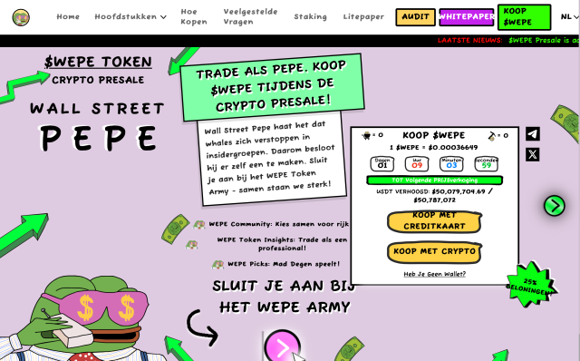 Als je ook lid wilt worden van het Wepe Army dan heb je tot morgen de tijd om je WEPE tokens te kopen voor de lage prijs van $0,00036649. Daarna gaat de volgende fase van de presale in en dan komt er een nieuwe prijsverhoging. Op de officiële website van Wall Street Pepe kun je je wallet koppelen en betalen met crypto en je creditcard.