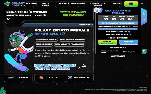 Sinds de lancering van de presale hebben ze al bijna $11 miljoen weten op te halen aan vroege investeringen. Wil je ook als vroege investeerder instappen dan kan dit via de officiële website van Solaxy. Daar heb je de mogelijkheid om te betalen met crypto en je creditcard.