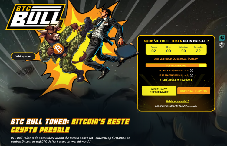 Bitcoin Bull heeft tijdens de presale al $4,1 miljoen opgehaald en je kan nu nog meedoen. Een token kost op dit moment $0,00243 per $BTCBULL. Exclusief de trading fees, heb je dus al 50.000 $BTCBULL tokens voor $121,5. Let wel op, want deze prijs zal binnen twee dagen weer hoger worden.