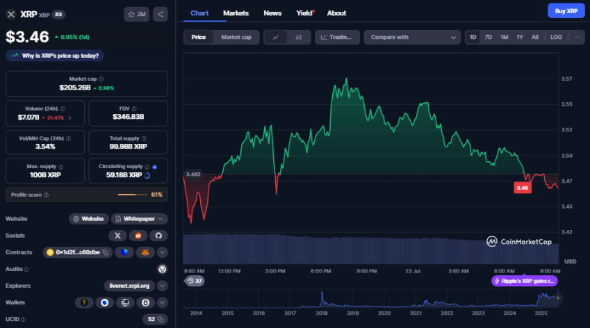 Op dit moment handelt XRP op $3,46, vergelijkbaar met 24 uur geleden. Eerder deze week doorbrak de altcoin echter nog de $3,50.