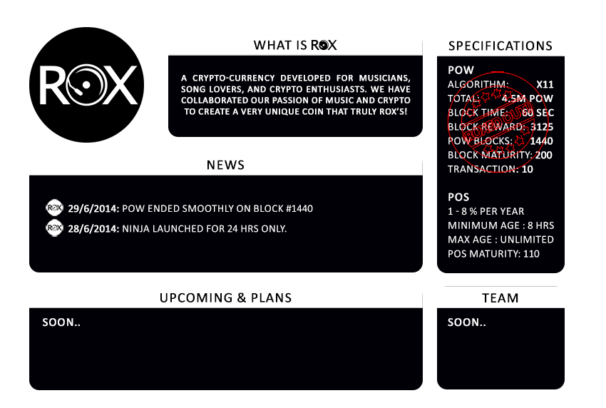 Roxcoin was released just a few days ago, and it was a ninja launch. Therefore, not much hashpower was directed to it in a short period of time. The ninja launch lasted 24 hours due to a incredibly fast PoW phase which only lasted a day. RoxCoin runs on the X11 algorithm with a total of 4.5 million mined during the PoW phase. Now, what seperates this coin from the usual mediocre stock? They claim its a coin made for musicians, or simply music lovers in that sense. It also claims to bring features that will make music easier to access.