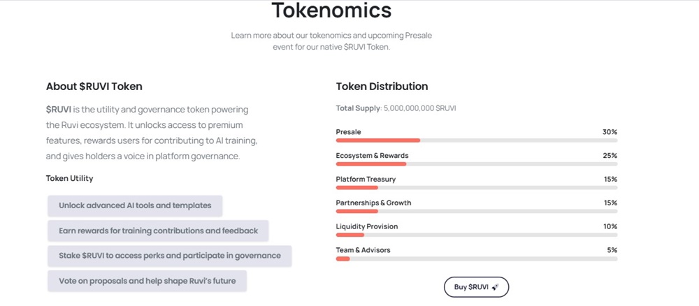 ในด้านเทคนิค Ruvi มีอุปทานรวมคงที่ที่ 5,000,000,000 โทเค็น (5 พันล้านโทเค็น) ซึ่งถูกจัดสรรอย่างรอบคอบเพื่อสนับสนุนการเติบโตที่ยั่งยืน จูงใจการมีส่วนร่วมของชุมชน สนับสนุนการพัฒนา และสร้างสภาพคล่องระยะยาว โทเค็น $RUVI จะเปิดตัวผ่านการเปิดขายล่วงหน้าหลายขั้นตอน (multi-phase presale) เพื่อระดมทุนสำหรับการพัฒนา โครงสร้างพื้นฐาน และการตลาด