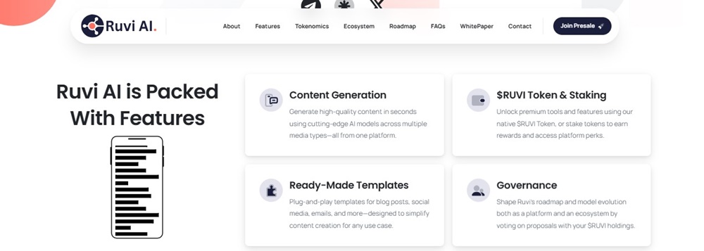 Ruvi AI เป็น superapp AI แบบกระจายอำนาจที่รวมเครื่องมือปัญญาประดิษฐ์ล้ำสมัยและเทคโนโลยี Web3 ไว้ในแพลตฟอร์มเดียวที่เข้าถึงได้ ออกแบบมาสำหรับครีเอเตอร์ มืออาชีพ และนักพัฒนา Ruvi ผสานรวมความสามารถ AI ที่หลากหลาย เช่น การสร้างข้อความ การสร้างภาพ การสังเคราะห์วิดีโอ และการผลิตเสียง ภายในประสบการณ์ผู้ใช้ที่ราบรื่น นอกเหนือจากเครื่องมือ AI ตามความต้องการแล้ว Ruvi ยังมีไลบรารีเทมเพลตที่ปรับแต่งได้สำหรับความต้องการเนื้อหาที่หลากหลาย ตั้งแต่โพสต์บล็อกและเนื้อหาโซเชียลมีเดีย ไปจนถึงงานเขียนเชิงวิชาการและสื่อธุรกิจ