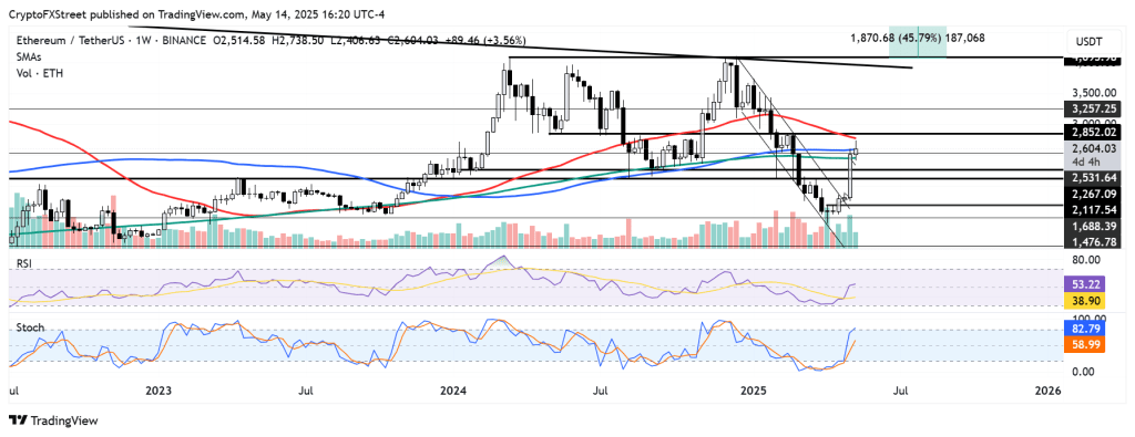 ตัวชี้วัดทางเทคนิคให้สัญญาณผสม โดยดัชนี RSI อยู่เหนือระดับเป็นกลางเล็กน้อย ขณะที่ Stochastic Oscillator (Stoch) กำลังทดสอบโซนภาวะซื้อมากเกินไป การปิดเทียนรายสัปดาห์เหนือระดับเป็นกลางของดัชนีเหล่านี้จะเป็นสัญญาณบวกที่อาจผลักดันให้ราคา ETH ทะลุ $2,850