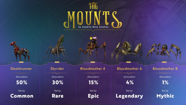 The Mounts come in five levels of rarity: Common, Rare, Epic, Legendary, and Mythic. In addition, each Mount has unique traits and allocations.