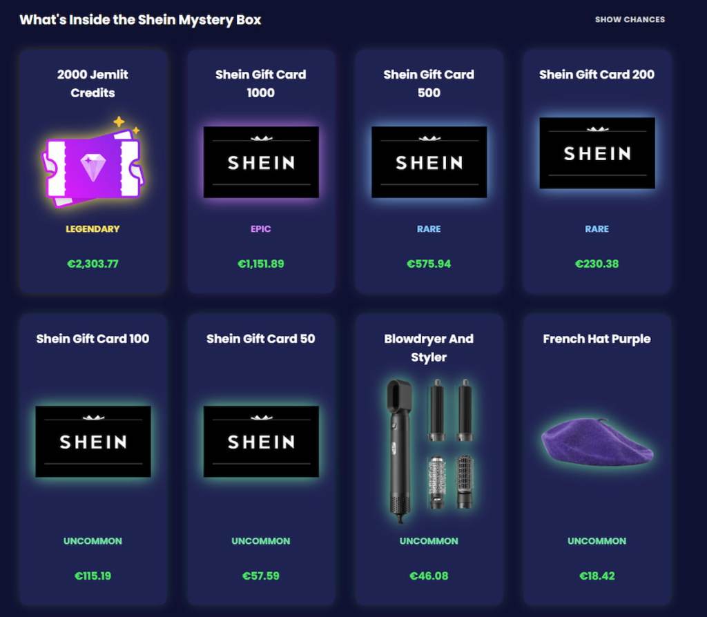 JemLit vám umožňuje zažít radost z objevování – Shein boxy často obsahují stylové kousky oblečení, módní doplňky nebo dokonce dárkové karty. To vše náhodně a férově, díky algoritmu, který zajišťuje spravedlivé rozdělování výher.