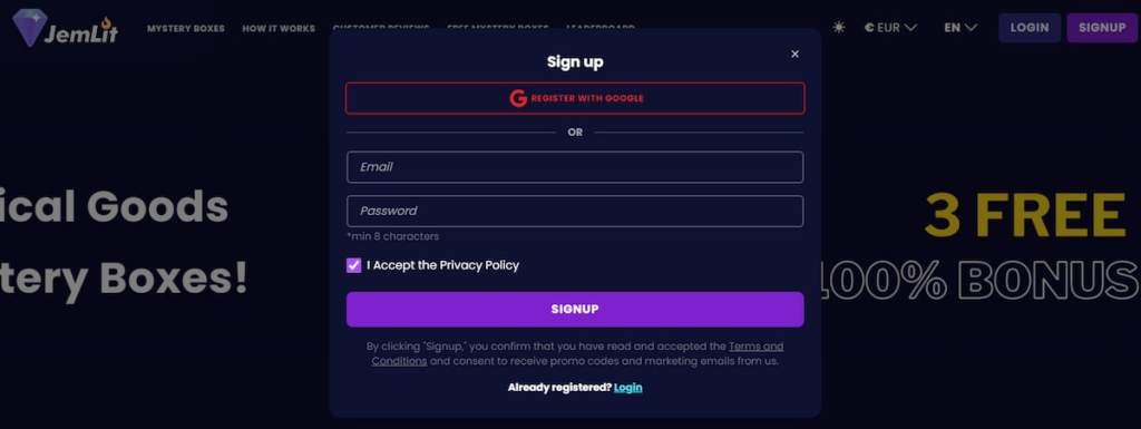 Prvním krokem je vytvoření účtu na JemLit. Registrace je zdarma a zabere jen pár minut. Navštívil jsem oficiální stránku JemLitu, klikl na registraci a vyplnil svůj e-mail spolu s heslem. Pokud je vám více než 18 let, nic vám nebrání začít. Po ověření e-mailu se můžete rovnou přihlásit do svého účtu a pustit se do objevování boxů.