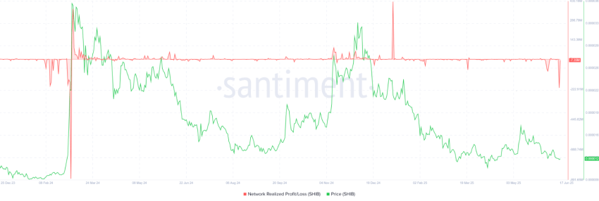 De Network Realized Profit/Loss (NPL) van Shiba Inu laat volgens data van Santiment zien dat “weak hands” momenteel massaal SHIB tokens verkopen. Dit zijn SHIB investeerders die hun buit vaak verkopen tijdens een dip. Zoals in de grafiek hieronder te zien is, vond er op 16 juni een grote sell-off plaats. In totaal werden er 211 miljoen SHIB tokens verkocht.