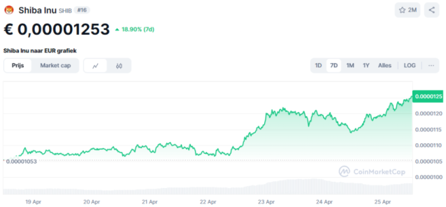 De $SHIB koers steeg de afgelopen zeven dagen met bijna 20%. Een belangrijke reden is de daling van grote beursvoorraden. Minder aanbod op exchanges kan de prijs sneller laten stijgen wanneer de vraag toeneemt.