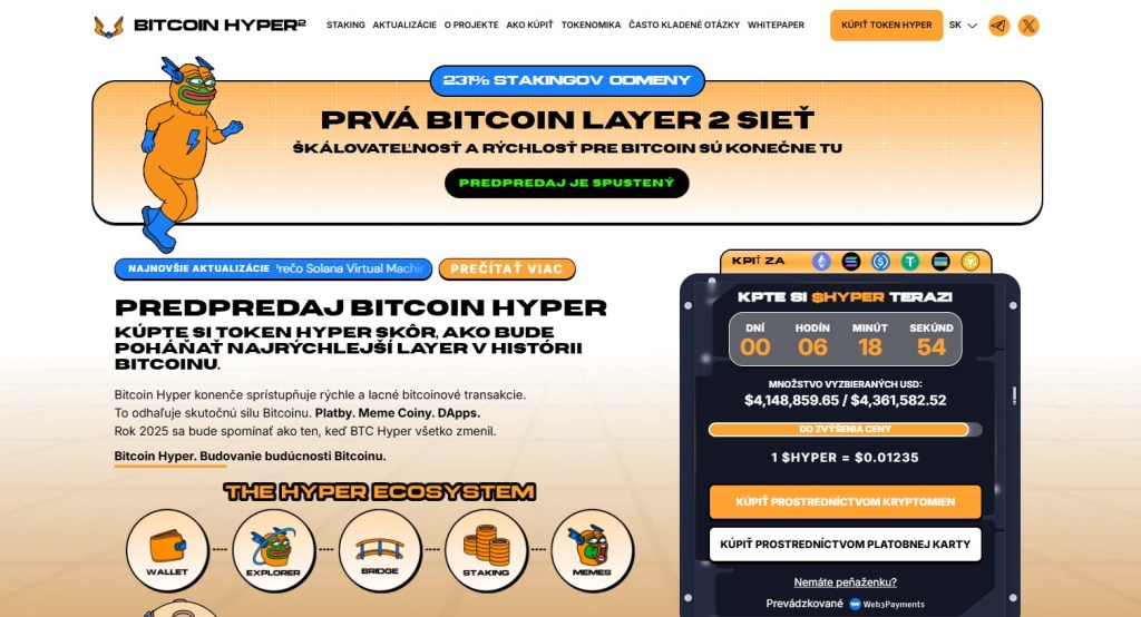 Bitcoin Hyper redefinuje, čo znamená kryptomena novej generácie v roku 2025. Navštívte oficiálnu webovú stránku, keďže sa blížia listingy a rastie záujem komunity. Bitcoin Hyper spája najmodernejšiu blockchainovú technológiu a funkcie využiteľné v reálnom svete, pričom ponúka rýchle transakcie, nízke poplatky a riadenie zamerané na komunitu.
