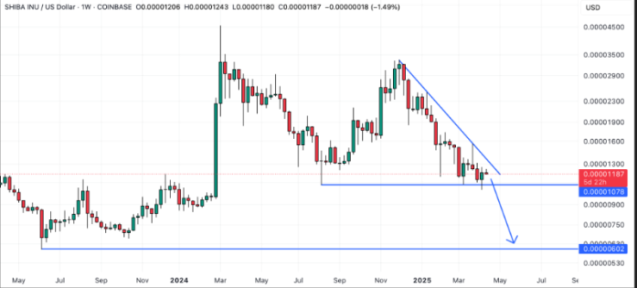 Kamēr lejupslīdes temps pēdējos divos mēnešos vai tā ir palēninājies, Shiba Inu cena ir izveidojusi pēdējo lejupslīdes trīsstūra formu.