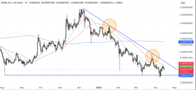 Šogad Shiba Inu 21 un 50 dienu slīdošie vidējie rādītāji (DMA) ir bijuši spēcīgi pretestības līmeņi atkārtoti, kā arī lejupslīdes tendence kopš 2024. gada decembra augstumiem.