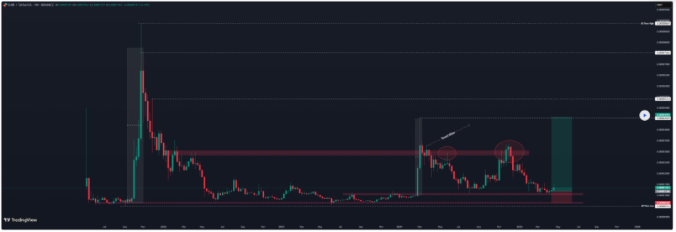 Voordat dit doel bereikt wordt, moet de koers eerst enkele belangrijke resistance niveaus doorbreken. Het eerste niveau bevindt zich op $0,00001565, de neklijn van een kleiner double bottom patroon dat onlangs is gevormd. Daarna volgt $0,000022, wat overeenkomt met het 50% Fibonacci Retracement niveau. Het doorbreken van deze niveaus zou de positieve trend verder bevestigen.