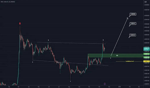 The analyst highlighted several waves from A to E in his price chart. The first wave began around April 2024, followed by the second wave in June and the third wave in August. Interestingly, Wave C was identified during a major market correction, during which the Shiba Inu price experieced notable declines. By the fourth wave, Shiba Inu was out of its correction phase and rallying significantly.