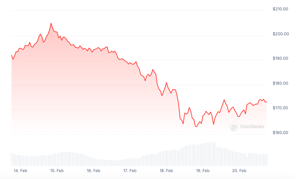 Цената на Solana беше нестабилна от началото на 2025 г. В началото на февруари 2025 г. токенът $SOL се търгуваше на средна цена от $230, но до средата на месеца падна до $194. През същия период броят на транзакциите в мрежата Solana също намаля с 20%.