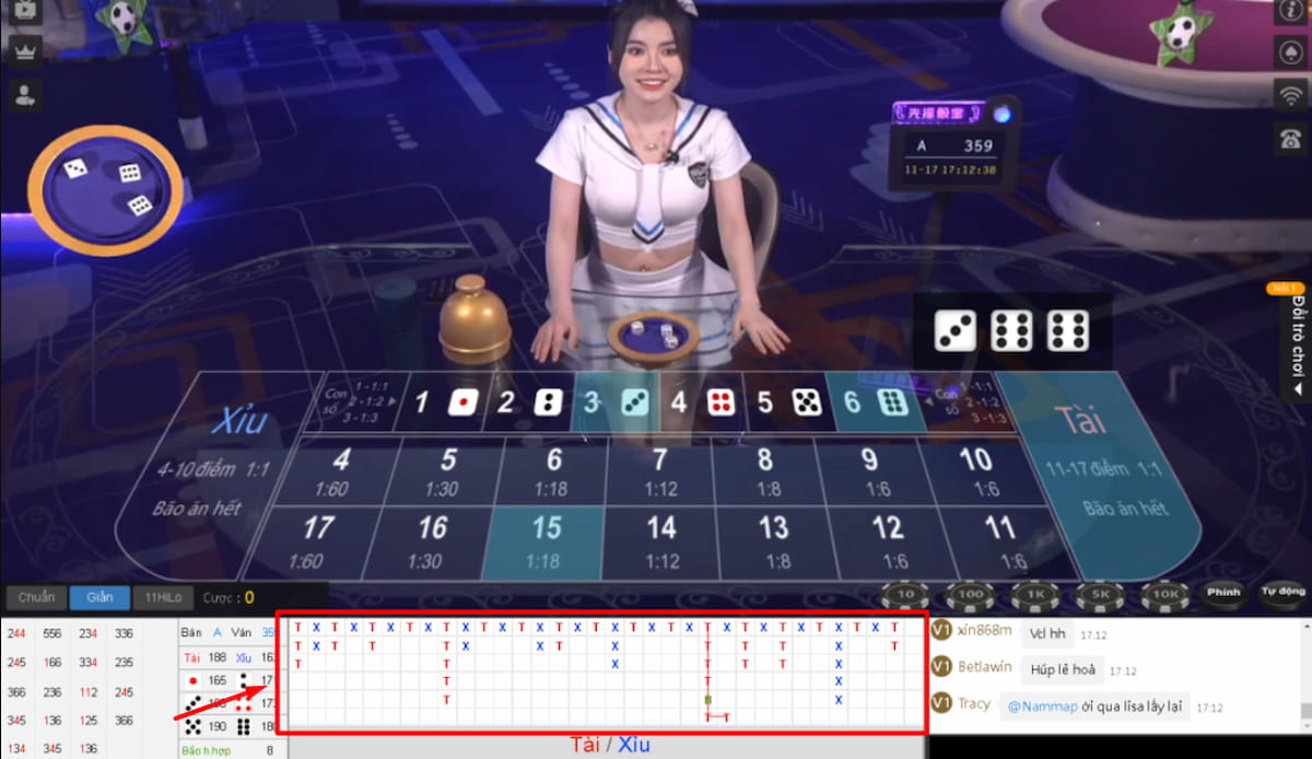 | Xỉu | Tổng 3 viên xúc xắc từ 3 – 10 điểm | 1:1 |