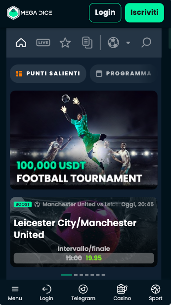 Chiudiamo la nostra classifica dei siti di scommesse stranieri con Mega Dice, una piattaforma innovativa che mette al primo posto la sicurezza e l’anonimato. Grazie all’assenza dei controlli KYC, i giocatori possono registrarsi e scommettere senza dover inviare documenti personali, garantendo così massima privacy e protezione dei dati.