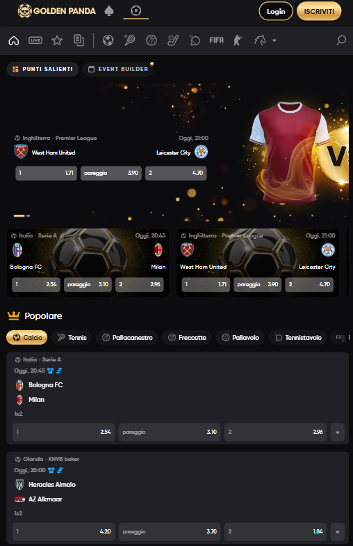 Grazie ai suoi bonus scommesse senza deposito siti stranieri e a un’offerta sportiva senza pari, Golden Panda è tra i siti di scommesse stranieri da provare assolutamente!